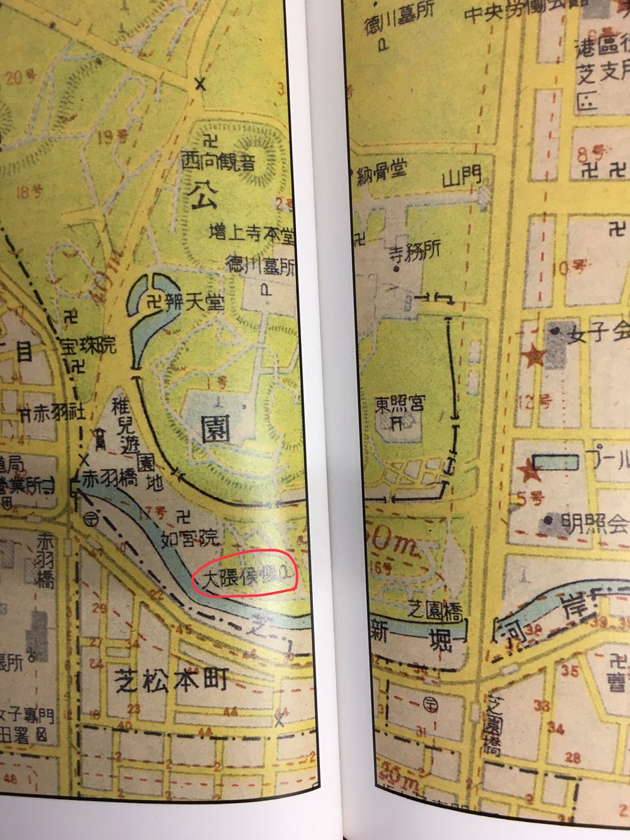 古地図(昭和12年時点)より、現存しない「衣冠束帯姿の大隈重信像」の位置を推定しました。