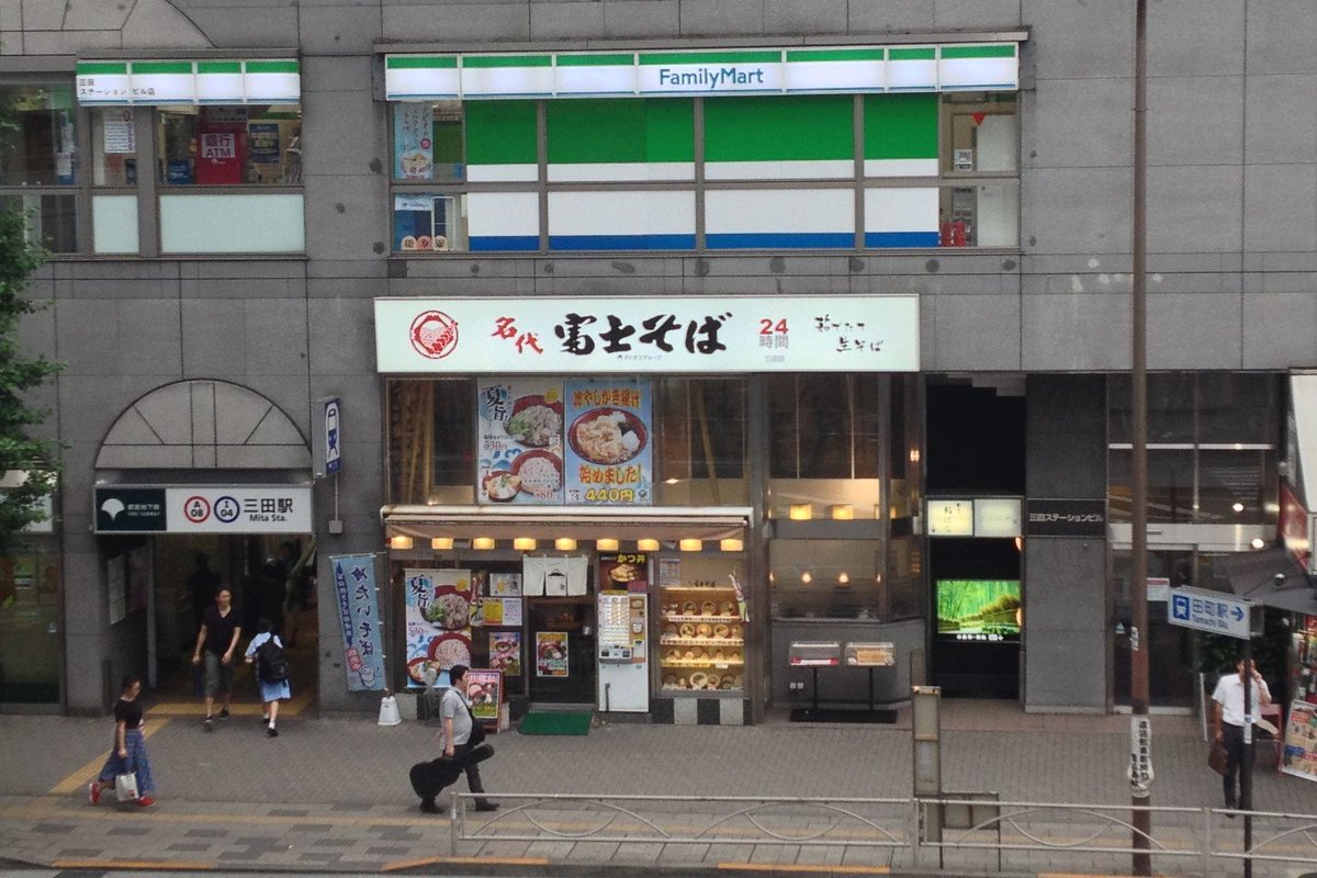 「名代 富士そば 三田店」は、「都営地下鉄 三田駅」駅ビル「三田ステーションビルアミタ」にある、一日 5 万食近くを販売している蕎麦チェーン店です。