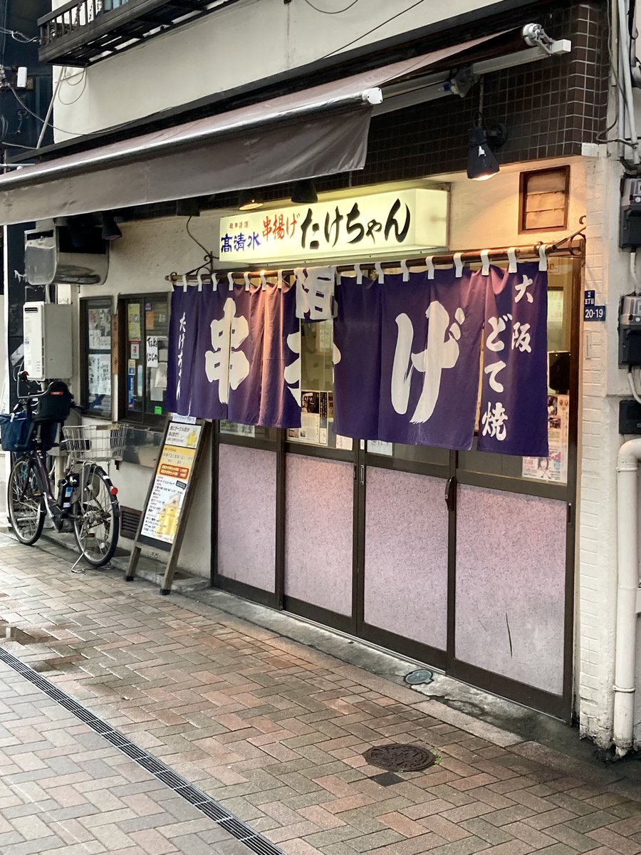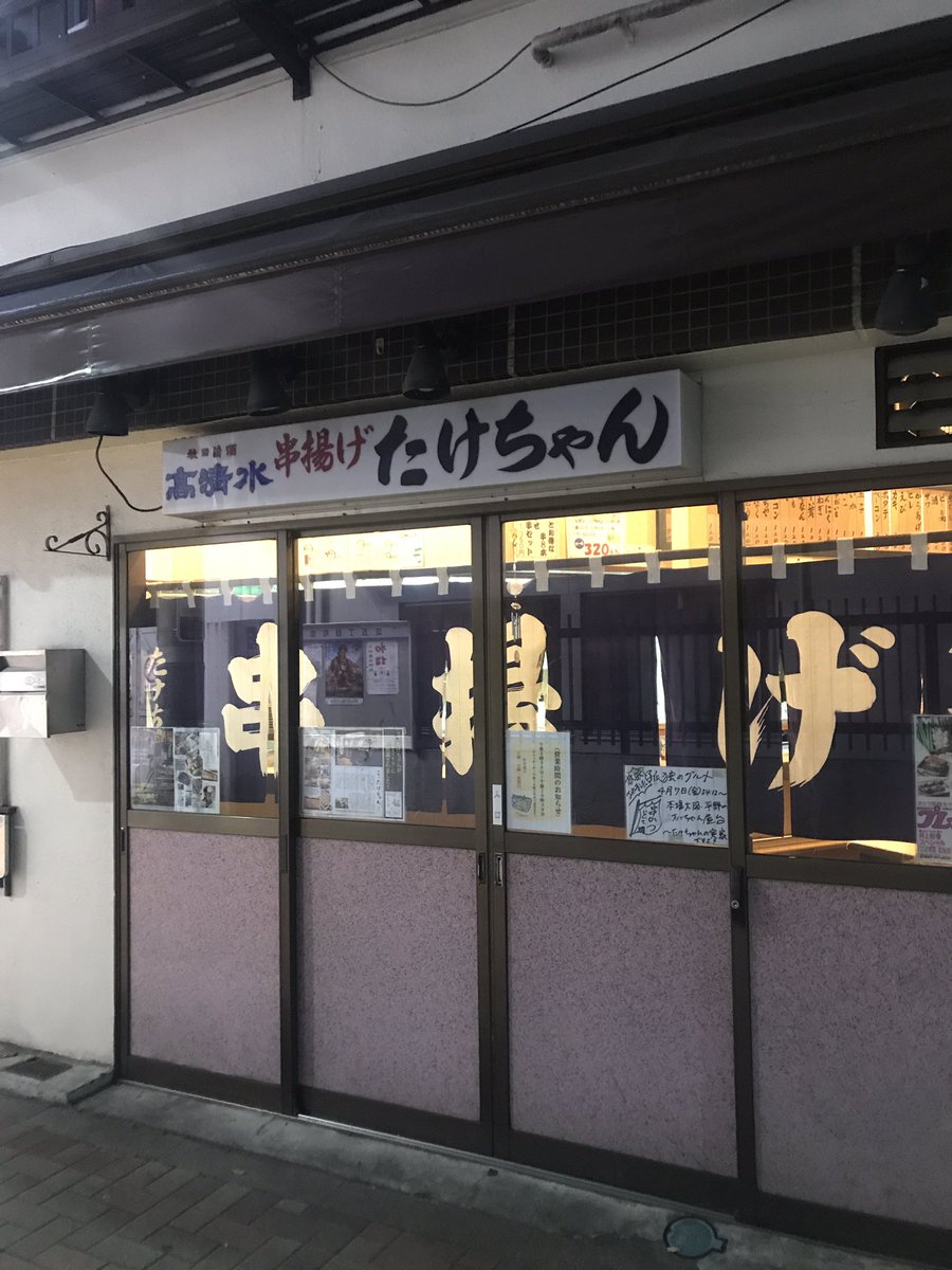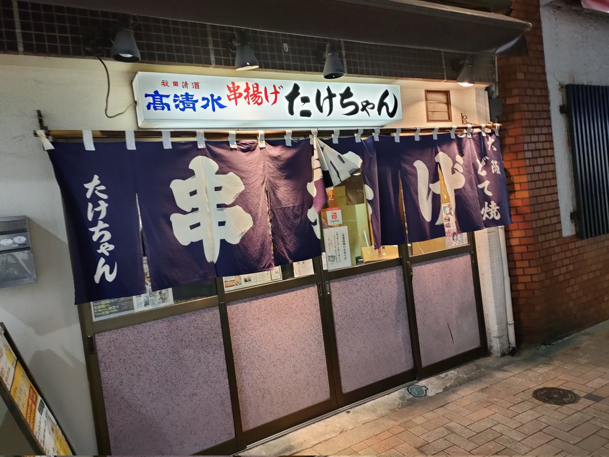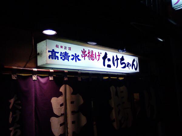 2011年7月4日13時35分。営業前の「串揚げ たけちゃん」を撮影しました。入口上には「秋田清酒 高清水 串揚げ たけちゃん」と掲示されています。 -