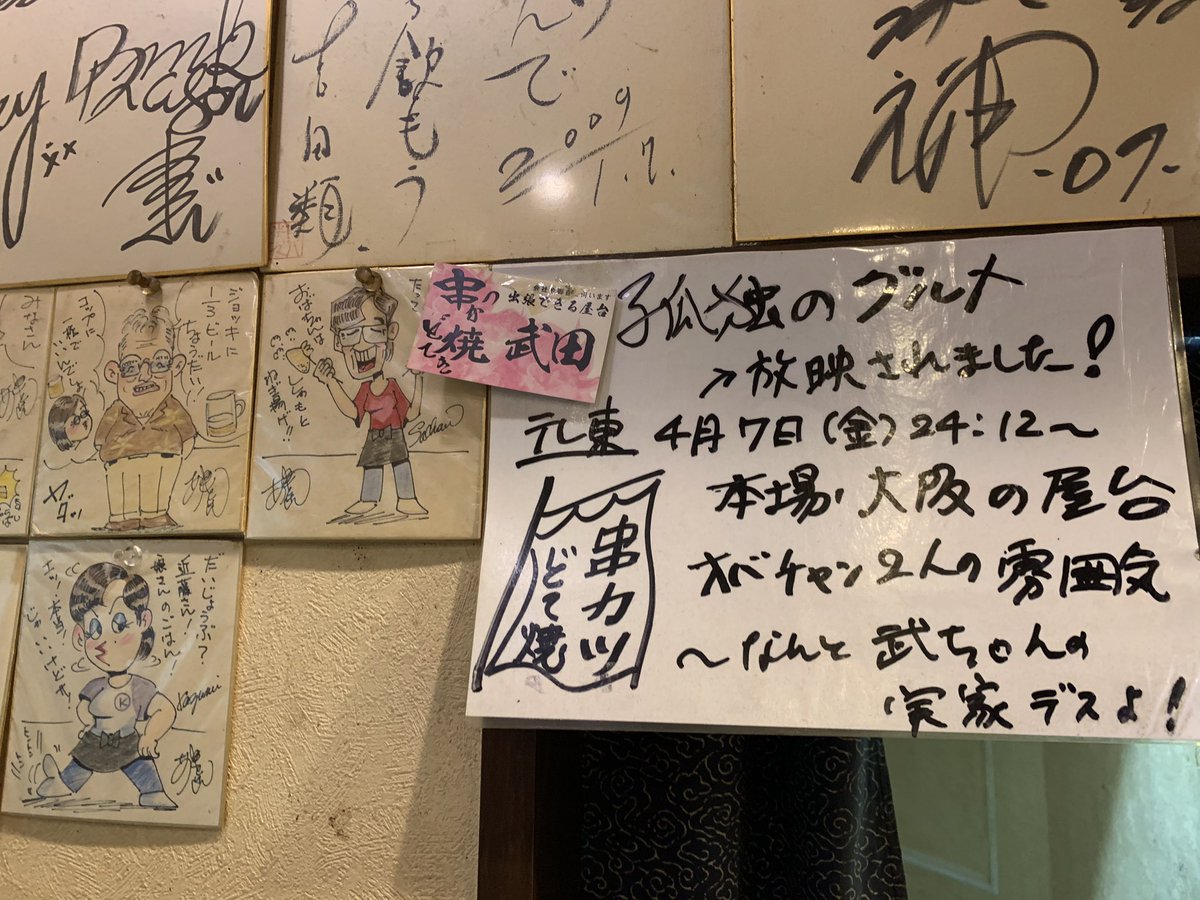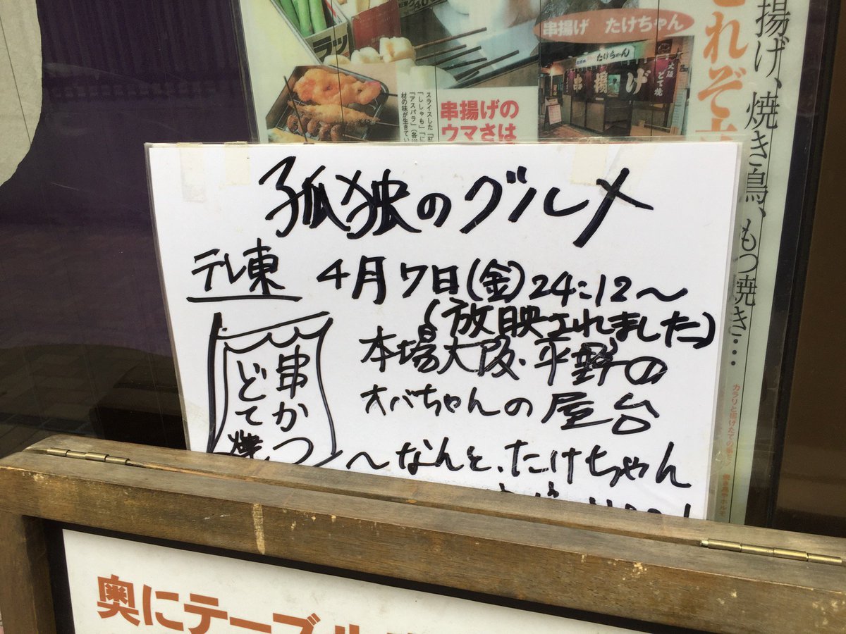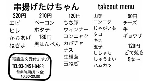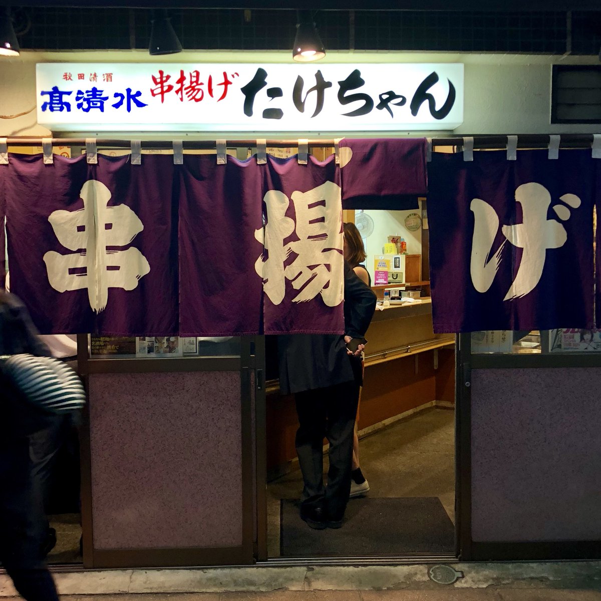2010年12月5日16時48分。営業前の「串揚げ たけちゃん」を撮影しました。入口右側の窓には、「集英社が発行する『プレイボーイ』に掲載された紹介記事」も貼られています。